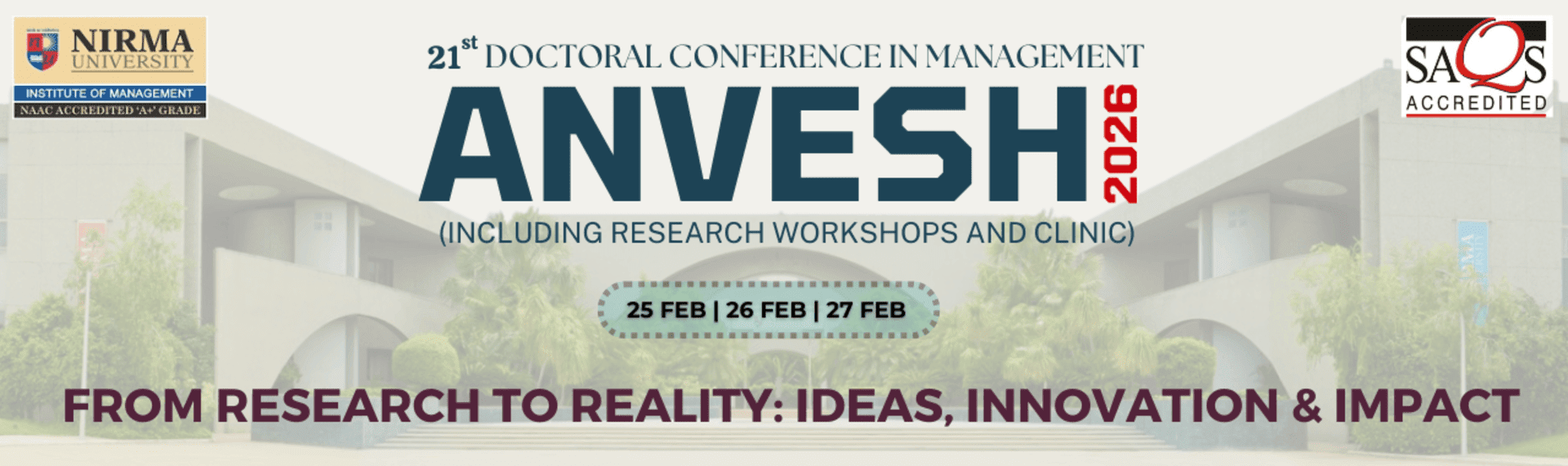 Anvesh 2026 is celebrating the 21st edition of the prestigious Doctoral Conference in Management organised by the Institute of Management, Nirma University. This annual conference serves as a global platform for doctoral students, providing a range of engaging activities that include paper presentations, academic discussions, research clinics, and workshops. The primary aim of Anvesh is to foster collaboration among research scholars from around the world. Participants will have the opportunity to engage in insightful conversations, share valuable knowledge and experiences, and explore new research avenues that could significantly influence the future of management studies.