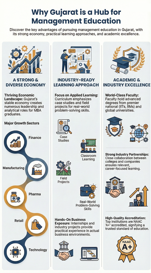 India has more than three lakh MBA aspirants each year. A large share of them comes from Western India. This shows trust in Gujarat’s learning environment. Students want reliable teaching and real exposure to industries. Gujarat’s colleges improve their systems to support these goals and help students develop strong fundamentals.